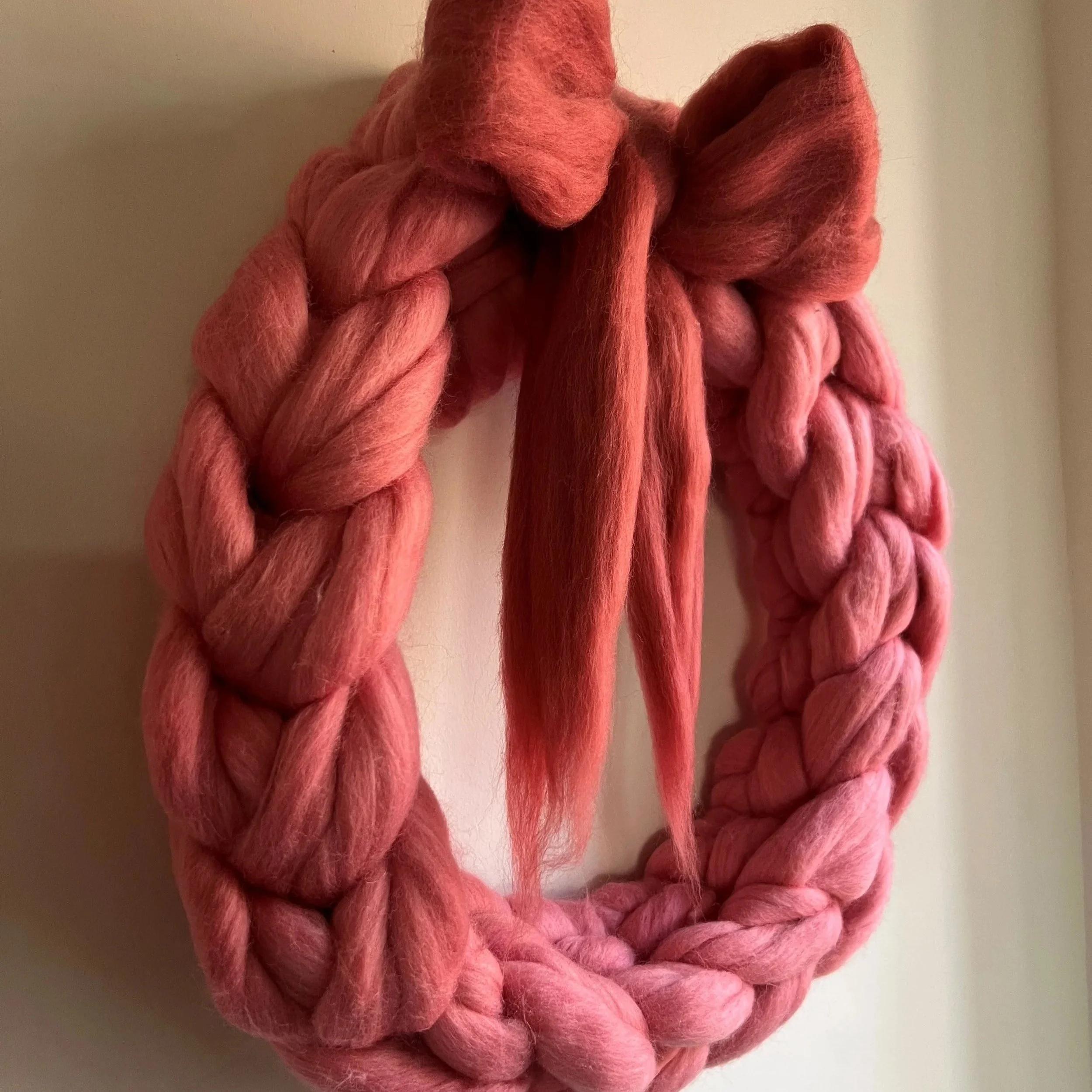 In the workshop, Ally will teach you how to create the wreath using a wire wreath frame and soft merino wool, then we will finish with a cute bow.