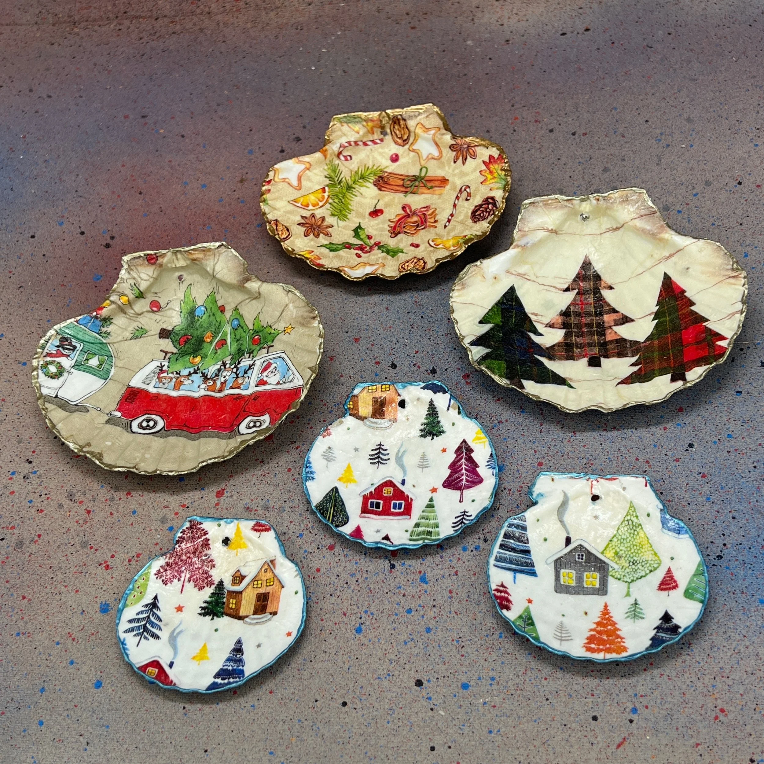 The large shells can be used as Christmas Tree decorations or as a trinket dish. Your small creations will be pre-drilled for hanging and will be finished with a protective varnish ready for you to take home.