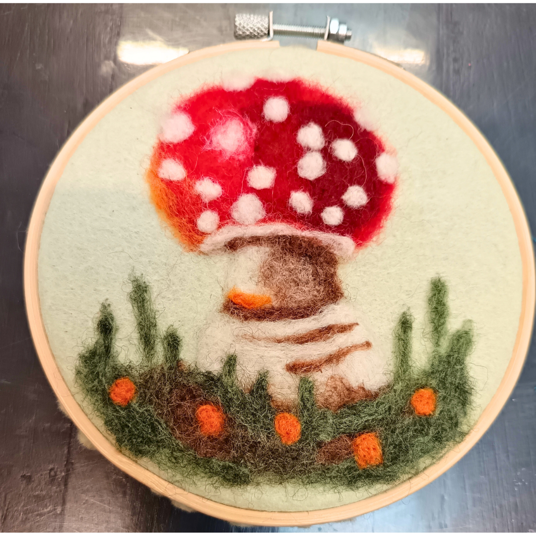 3D needle felted mushroom and needle felted picture.